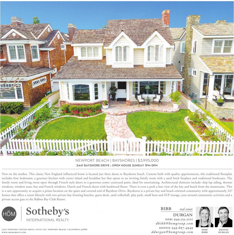 NEWPORT BEACH | BAYSHORES | $3,995,000 2441 bayshore drive : open house sunday 1pm-5pm New on the market. This classic New England influenced home is located just three doors to Bayshores beach. Custom built with quality appointments, this traditional floorplan includes four bedrooms, a gourmet kitchen with center island and breakfast bar that opens to an inviting family room with a used brick fireplace and traditional bookcases. The family room and living room open through French style doors to a generous center courtyard patio, ideal for entertaining. Architectural elements include: ship lap siding, dormer windows, window seats, bay and French windows, Dutch and French doors with hardwood floors. There is even a peek a boo view of the bay and beach from the mastersuite. This is a rare opportunity to acquire a prime location on the quiet and coveted end of Bayshore Drive. Bayshores is a private bay and beach oriented community with approximately 247 homes that offers a resort lifestyle with two private bay fronting beaches, guest dock, sand volleyball, play park, small boat and SUP storage, year-around community activities and a private access gate to the Balboa Bay Club Resort. 1200 newport center drive, suite 100, newport beach, california 92660 www.homgroup.com bibb real estate durgan debi 949.533.5101 dbibb@homgroup.com dennis 949.697.4949 ddurgan@homgroup.com debi bibb dennis durgan