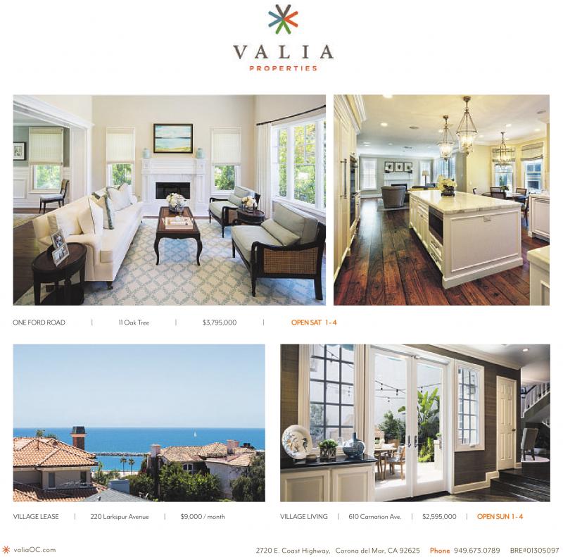 ONE FORD ROAD | 11 Oak Tree | $3,795,000 | OPEN SAT 1-4 VILLAGE LEASE | 220 Larkspur Avenue | $9,000 /month VILLAGE LIVING | 610 Carnation Ave. | $2,595,000 | OPEN SUN 1-4 valiaOC.com 2720 E. Coast Highway, Corona del Mar, CA 92625 Phone 949.673.0789 BRE#01305097