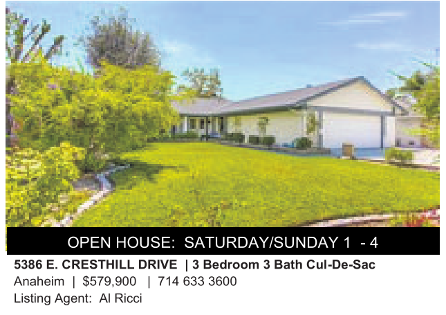 OPEN HOUSE: SATURDAY/SUNDAY 1 - 4 5386 E.CRESTHILL DRIVE | 3Bedroom 3Bath Cul-De-Sac Anaheim | $579,900 | 714 633 3600 Listing Agent: AlRicci