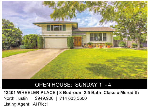 OPEN HOUSE: SUNDAY 1 - 4 13401 WHEELER PLACE |3Bedroom 2.5 Bath Classic Meredith North Tustin | $949,900 | 714 633 3600 Listing Agent: AlRicci