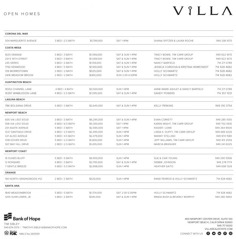 605 VIA LIDO SOUD 3 BED | 3 BATH $6,295,000 SAT & SUN 1-4PM EVAN CORKETT 949 285 1055 938 VIA LIDO SOUD 6 BED | 6.5 BATH $5,350,000 SAT 1-4PM KAREN WIGHT, TIM CARR GROUP 949 702 0610 201 AGATE AVENUE 5 BED | 3 BATH $2,595,000 SAT 1-4PM KIDDER | LOWE 949 264 9000 1227 SANTIAGO DRIVE 4 BED | 2.5 BATH $2,495,000 SUN 1-4PM LINDA K. DUFFY, TIM CARR GROUP 949 689 4226 321 ALISO AVENUE 5 BED | 4.5 BATH $2,479,000 SUN 1-4PM MANNY STELLINO 949 874 1580 1318 DOVER DRIVE 5 BED | 2.5 BATH $1,800,000 SUN 1-4PM JEFF WILLIAMS, TIM CARR GROUP 949 413 2559 507 BAY HILL DRIVE 2 BED | 2.5 BATH $1,435,000 SUN 1-4PM MARCIA BRASHIER 949 241 6025