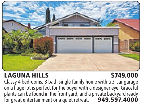 LAGUNA HILLS $749,000 Classy 4bedrooms,3bathsinglefamilyhome with a3-car garage on ahugelot is perfectfor thebuyer with adesigner eye. Graceful plants canbefoundinthe frontyard, andaprivate backyard ready for great entertainmentoraquietretreat. 949.597.4000
