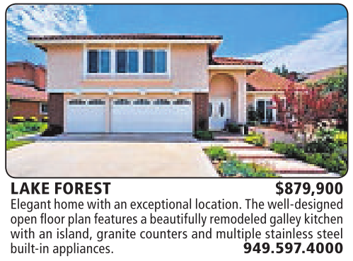 LAKE FOREST $879,900 Eleganthome with an exceptionallocation. Thewell-designed open floorplanfeaturesabeautifullyremodeled galley kitchen with an island, granite counters and multiple stainless steel built-in appliances. 949.597.4000