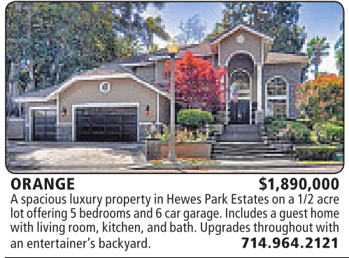 ORANGE $1,890,000 Aspacious luxurypropertyinHewesParkEstates on a1/2 acre lotoffering 5bedrooms and 6car garage. Includes aguest home with living room,kitchen,and bath.Upgrades throughoutwith an entertainer’s backyard. 714.964.2121