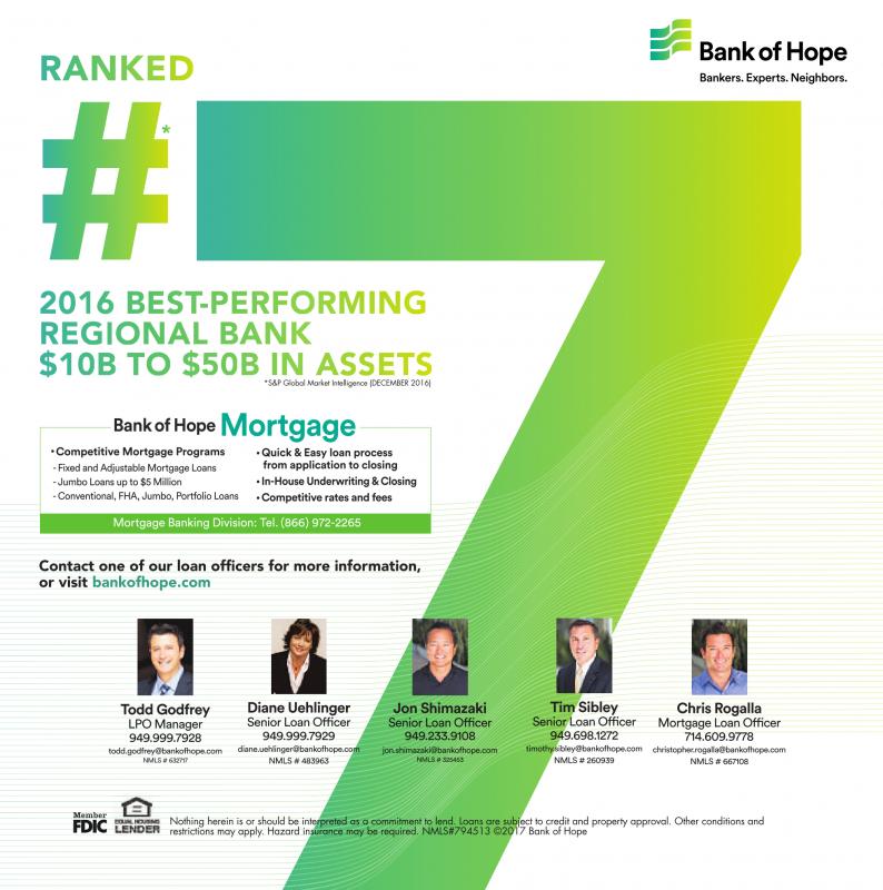 Nothing herein is or should be interpreted as a commitment to lend. Loans are subject to credit and property approval. Other conditions and restrictions may apply. Hazard insurance may be required. NMLS#794513 ©2017 Bank of Hope