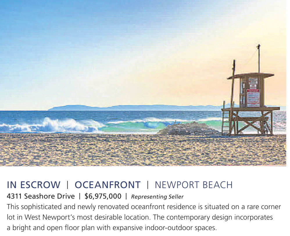 4311 Seashore Drive | $6,975,000 | Representing Seller This sophisticated and newly renovated oceanfront residence is situated on a rare corner lot in West Newport’s most desirable location. The contemporary design incorporates a bright and open floor plan with expansive indoor-outdoor spaces.
