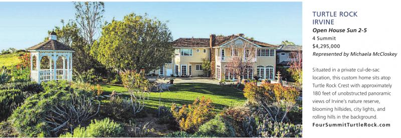 TURTLE ROCK IRVINE Open House Sun 2-5 4 Summit $4,295,000 Represented by Michaela McCloskey Situated in a private cul-de-sac location, this custom home sits atop Turtle Rock Crest with approximately 180 feet of unobstructed panoramic views of Irvine’s nature reserve, blooming hillsides, city lights, and rolling hills in the background. FourSummitTurtleRock.com