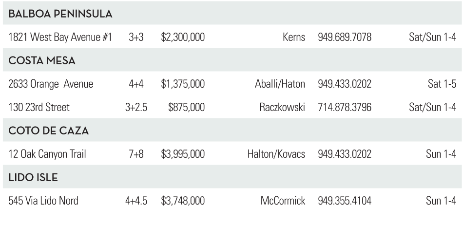 COSTA MESA 2633 Orange Avenue 4+4 $1,375,000 Aballi/Haton 949.433.0202 Sat 1-5 130 23rd Street 3+2.5 $875,000 Raczkowski 714.878.3796 Sat/Sun 1-4 COTO DE CAZA 12 Oak Canyon Trail 7+8 $3,995,000 Halton/Kovacs 949.433.0202 Sun 1-4 LIDO ISLE 545 ViaLido Nord 4+4.5 $3,748,000 McCormick 949.355.4104 Sun 1-4