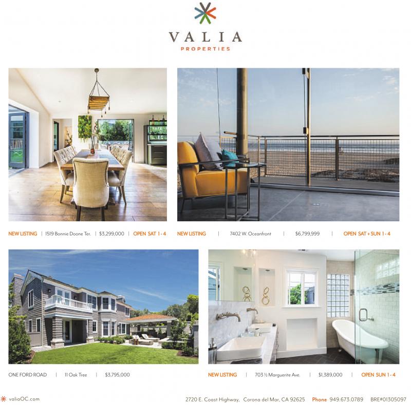 NEW LISTING | 1519 Bonnie Doone Ter. | $3,299,000 | OPEN SAT 1-4 NEW LISTING | 7402 W. Oceanfront | $6,799,999 | OPEN SAT+SUN 1-4 ONE FORD ROAD | 11 Oak Tree | $3,795,000 NEW LISTING | 703½Marguerite Ave. | $1,389,000 | OPEN SUN 1-4 valiaOC.com 2720 E. Coast Highway, Corona del Mar, CA 92625 Phone 949.673.0789 BRE#01305097