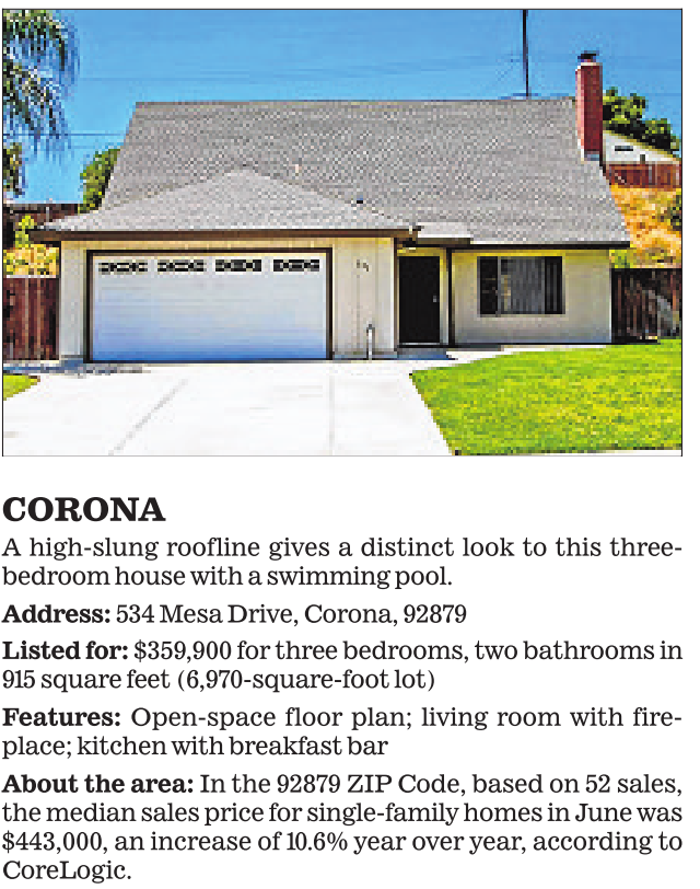 CORONA A high-slung roofline gives a distinct look to this threebedroom house with a swimming pool. Address: 534 Mesa Drive, Corona, 92879 Listed for: $359,900 for three bedrooms, two bathrooms in 915 square feet (6,970-square-foot lot) Features: Open-space floor plan; living room with fireplace; kitchen with breakfast bar About the area: In the 92879 ZIP Code, based on 52 sales, the median sales price for single-family homes in June was $443,000, an increase of 10.6% year over year, according to CoreLogic. See also