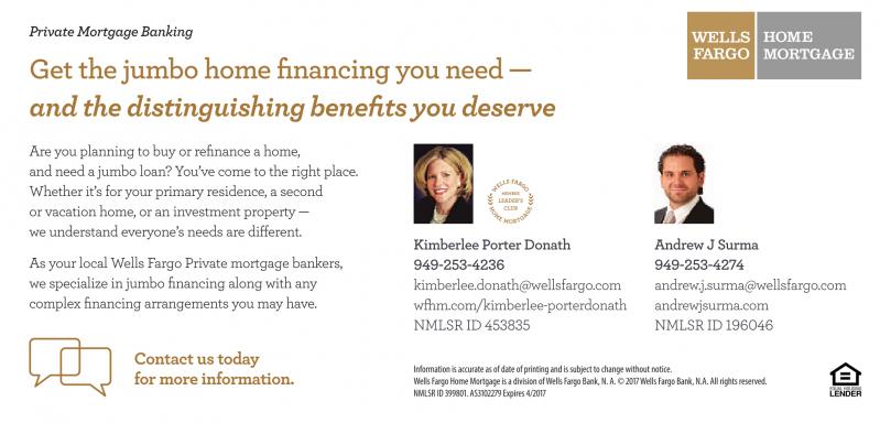 As your local Wells Fargo Private mortgage bankers, we specialize in jumbo financing along with any complex financing arrangements you may have.