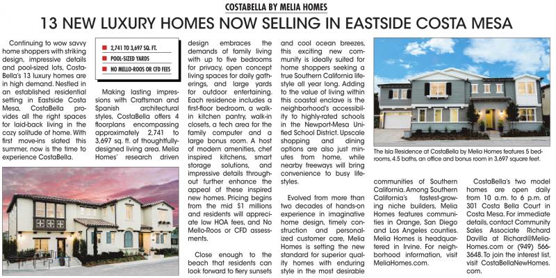 CostaBella’s two model homes are open daily from 10 a.m. to 6 p.m. at 301 Costa Bella Court in Costa Mesa. For immediate details,contact Community Sales Associate Richard Davilla at Richard@Melia- Homes.com or (949) 566- 3648. To join the interest list, visit CostaBellaNewHomes. com.