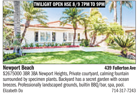 TWILIGHT OPEN HSE 8/9 7PM TO 9PM NewportBeach 439Fullerton Ave $2675000 3BR 3BA NewportHeights, Private courtyard, calming fountain surrounded by specimen plants. Backyard has asecret garden with ocean breezes. Professionally landscaped grounds, builtin BBQ/bar,spa, pool. Elizabeth Do 714-317-7243