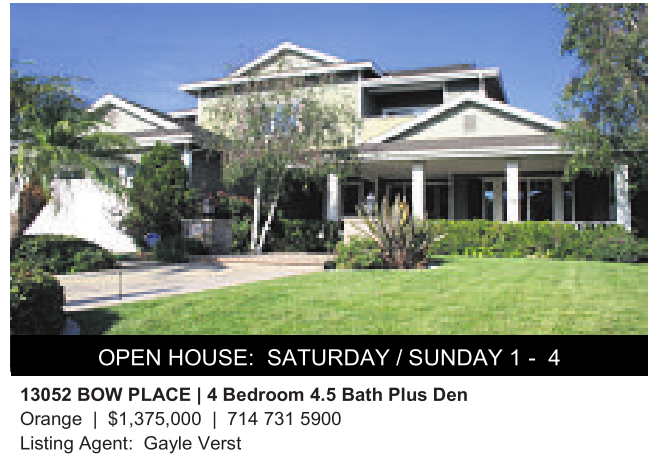 OPEN HOUSE: SATURDAY / SUNDAY 1 - 4 13052 BOW PLACE |4Bedroom 4.5 Bath Plus Den Orange | $1,375,000 | 714 731 5900 Listing Agent: Gayle Verst