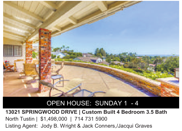OPEN HOUSE: SUNDAY 1 - 4 13021 SPRINGWOOD DRIVE |Custom Built 4Bedroom 3.5 Bath North Tustin | $1,498,000 | 714 731 5900 Listing Agent: Jody B.Wright &Jack Conners,/Jacqui Graves