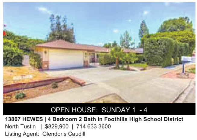 OPEN HOUSE: SUNDAY 1 - 4 13807 HEWES |4Bedroom 2Bath in Foothills High School District North Tustin | $829,900 | 714 633 3600 Listing Agent: Glendoris Caudill