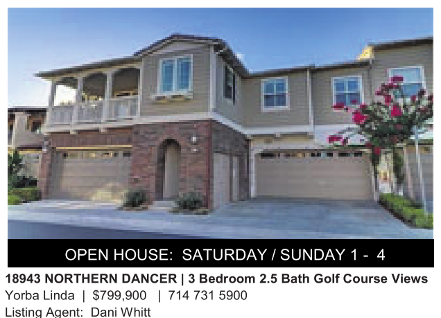 OPEN HOUSE: SATURDAY / SUNDAY 1 - 4 18943 NORTHERN DANCER |3Bedroom 2.5 Bath Golf Course Views Yorba Linda | $799,900 | 714 731 5900 Listing Agent: Dani Whitt