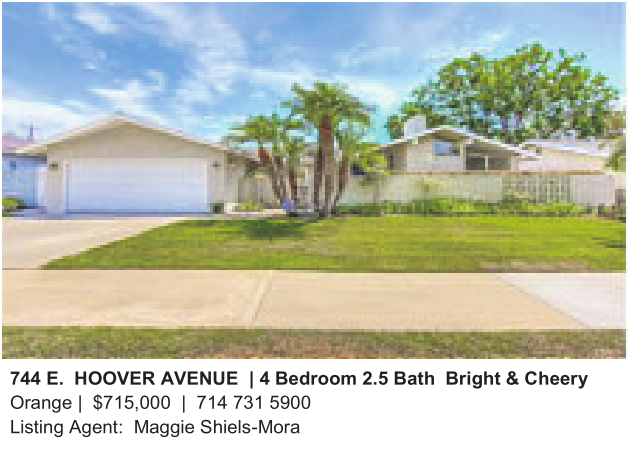 744 E. HOOVER AVENUE |4Bedroom 2.5 Bath Bright &Cheery Orange | $715,000 | 714 731 5900 Listing Agent: Maggie Shiels-Mora