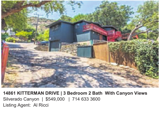 14861 KITTERMAN DRIVE |3Bedroom 2Bath With Canyon Views Silverado Canyon | $549,000 | 714 633 3600 Listing Agent: AlRicci