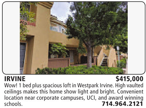 IRVINE $415,000 Wow! 1bed plus spacious loft in Westpark Irvine.Highvaulted ceilings makes this home show light and bright. Convenient location near corporate campuses, UCI, and award winning schools. 714.964.2121