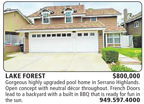 LAKE FOREST $800,000 Gorgeous highly upgraded pool home in Serrano Highlands. Open concept with neutral décor throughout. French Doors lead toabackyard with abuilt in BBQ that isready for fun in thesun. 949.597.4000
