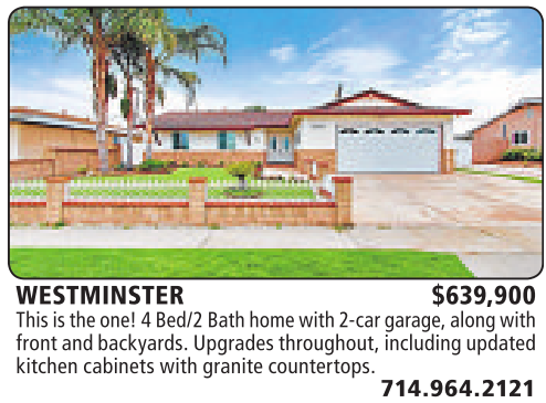 WESTMINSTER $639,900 This is theone!4Bed/2 Bath home with 2-cargarage, along with frontand backyards.Upgrades throughout,including updated kitchen cabinets with granitecountertops.