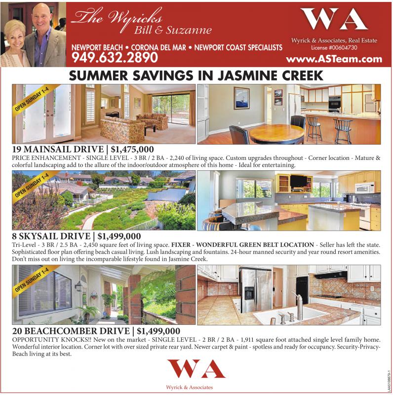 The Wyricks Bill & Suzanne NEWPORT BEACH • CORONA DEL MAR • NEWPORT COAST SPECIALISTS 949.632.2890 www.ASTeam.com SUMMER SAVINGS IN JASMINE CREEK Wyrick & Associates, Real Estate License #00604730 19 MAINSAIL DRIVE | $1,475,000 PRICE ENHANCEMENT - SINGLE LEVEL - 3 BR / 2 BA - 2,240 of living space. Custom upgrades throughout - Corner location - Mature & colorful landscaping add to the allure of the indoor/outdoor atmosphere of this home - Ideal for entertaining. 8 SKYSAIL DRIVE | $1,499,000 Tri-Level - 3 BR / 2.5 BA - 2,450 square feet of living space. FIXER - WONDERFUL GREEN BELT LOCATION - Seller has left the state. Sophisticated floor plan offering beach casual living. Lush landscaping and fountains. 24-hour manned security and year round resort amenities. Don’t miss out on living the incomparable lifestyle found in Jasmine Creek. 20 BEACHCOMBER DRIVE | $1,499,000 OPPORTUNITY KNOCKS!! New on the market - SINGLE LEVEL - 2 BR / 2 BA - 1,911 square foot attached single level family home. Wonderful interior location. Corner lot with over sized private rear yard. Newer carpet & paint - spotless and ready for occupancy. Security-Privacy- Beach living at its best.