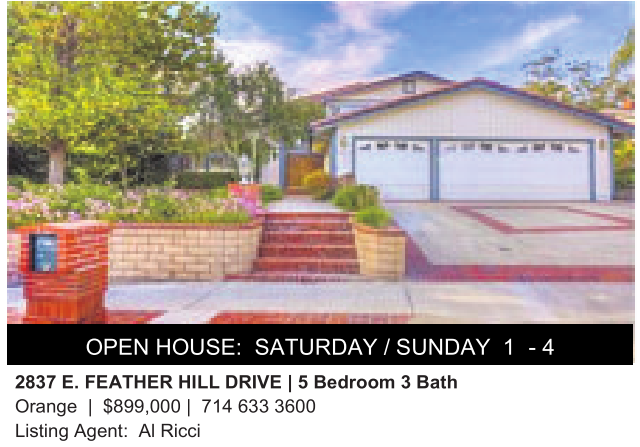 OPEN HOUSE: SATURDAY / SUNDAY 1 - 4 2837 E. FEATHER HILL DRIVE |5Bedroom 3Bath Orange | $899,000 | 714 633 3600 Listing Agent: AlRicci