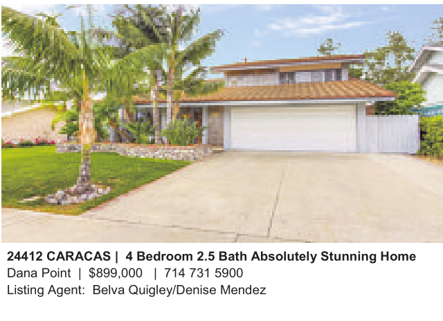 24412 CARACAS | 4 Bedroom 2.5 Bath Absolutely Stunning Home Dana Point | $899,000 | 714 731 5900 Listing Agent: Belva Quigley/Denise Mendez
