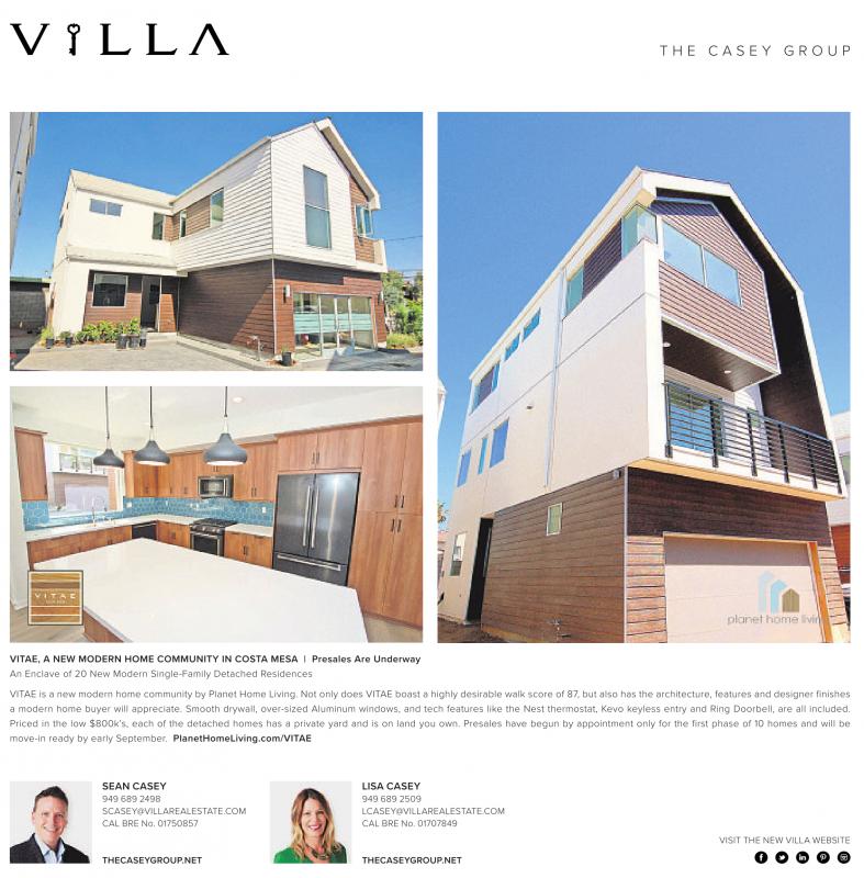 T H E C A S E Y G R O U P VITAE, A NEW MODERN HOME COMMUNITY IN COSTA MESA | Presales Are Underway An Enclave of 20 New Modern Single-Family Detached Residences VITAE is a new modern home community by Planet Home Living. Not only does VITAE boast a highly desirable walk score of 87, but also has the architecture, features and designer finishes a modern home buyer will appreciate. Smooth drywall, over-sized Aluminum windows, and tech features like the Nest thermostat, Kevo keyless entry and Ring Doorbell, are all included. Priced in the low $800k’s, each of the detached homes has a private yard and is on land you own. Presales have begun by appointment only for the first phase of 10 homes and will be move-in ready by early September. PlanetHomeLiving.com/VITAE SEAN CASEY 949 689 2498 SCASEY@VILLAREALESTATE.COM CAL BRE No. 01750857 LISA CASEY 949 689 2509 LCASEY@VILLAREALESTATE.COM CAL BRE No. 01707849 VISIT THE NEW VILLA WEBSITE THECASEYGROUP.NET THECASEYGROUP.NET