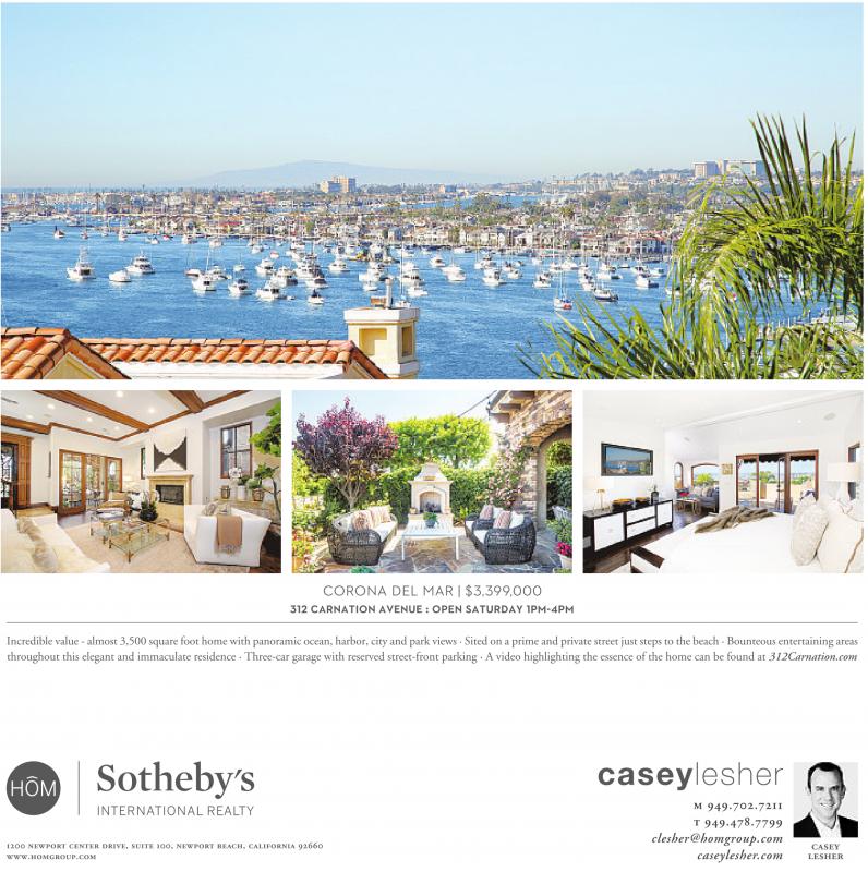 CORONA DEL MAR | $3,399,000 312 carnation avenue : open saturday 1pm-4pm Incredible value -almost 3,500 square foot home with panoramic ocean, harbor, city and park views Sited on aprime and private street just steps to the beach Bounteous entertaining areas throughout this elegant and immaculate residence Three-car garage with reserved street-front parking A video highlighting the essence of the home can be found at 312Carnation.com 1200 newport center drive, suite 100, newport beach, california 92660 www.homgroup.com caseylesher m 949.702.7211 t 949.478.7799 clesher@homgroup.com caseylesher.com casey lesher