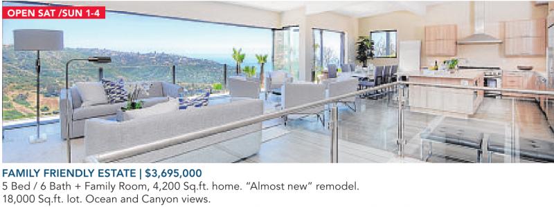 FAMILY FRIENDLY ESTATE | $3,695,000 5 Bed / 6 Bath + Family Room, 4,200 Sq.ft. home. “Almost new” remodel. 18,000 Sq.ft. lot. Ocean and Canyon views.