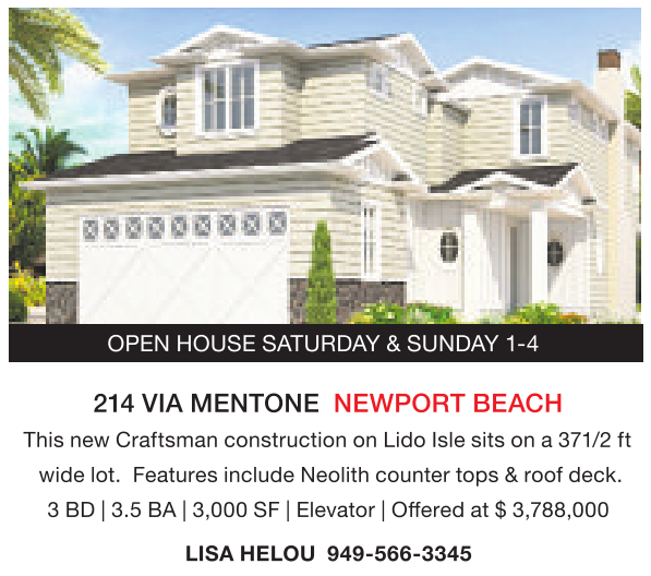 OPEN HOUSE SATURDAY & SUNDAY 1-4 214 VIA MENTONE NEWPORT BEACH This new Craftsman construction on Lido Isle sits on a371/2 ft wide lot. Features include Neolith counter tops &roof deck. 3BD|3.5 BA |3,000 SF |Elevator |Offered at $3,788,000 LISA HELOU 949-566-3345 See also