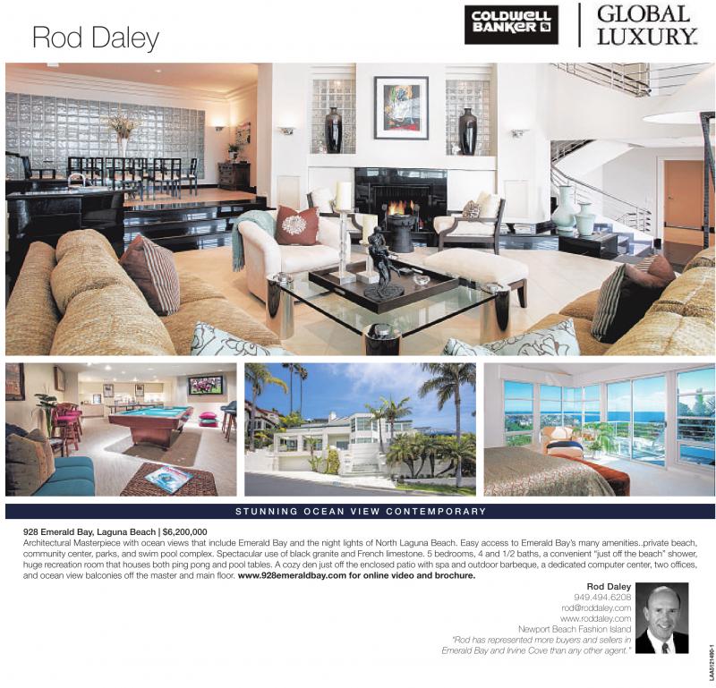 Rod Daley S T U N N I N G O C E A N V I E W C O N T E M P O R A RY 928 Emerald Bay, Laguna Beach | $6,200,000 Architectural Masterpiece with ocean views that include Emerald Bay and the night lights of North Laguna Beach. Easy access to Emerald Bay’s many amenities..private beach, community center, parks, and swim pool complex. Spectacular use of black granite and French limestone. 5 bedrooms, 4 and 1/2 baths, a convenient “just off the beach” shower, huge recreation room that houses both ping pong and pool tables. A cozy den just off the enclosed patio with spa and outdoor barbeque, a dedicated computer center, two offices, and ocean view balconies off the master and main floor. www.928emeraldbay.com for online video and brochure. Rod Daley 949.494.6208 rod@roddaley.com www.roddaley.com Newport Beach Fashion Island “Rod has represented more buyers and sellers in Emerald Bay and Irvine Cove than any other agent.”