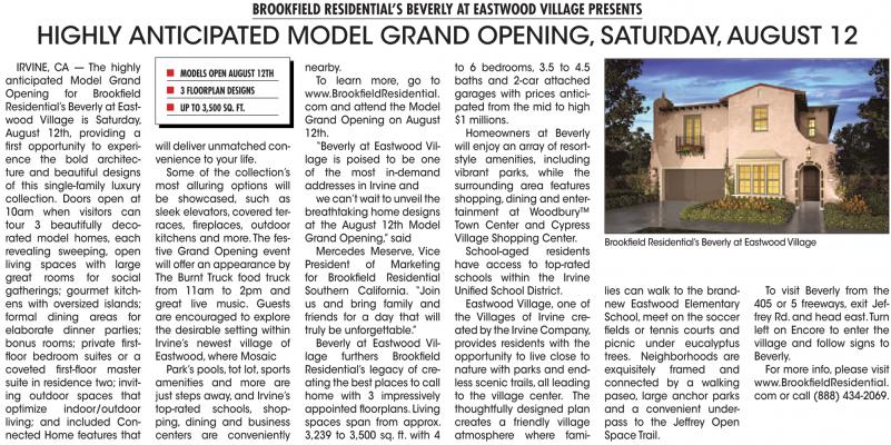 “Beverly at Eastwood Village is poised to be one of the most in-demand addresses in Irvine and we can’twait to unveil the breathtaking home designs at the August 12th Model Grand Opening,”said Mercedes Meserve, Vice President of Marketing for Brookfield Residential Southern California. “Join us and bring family and friends for a day that will truly be unforgettable.”