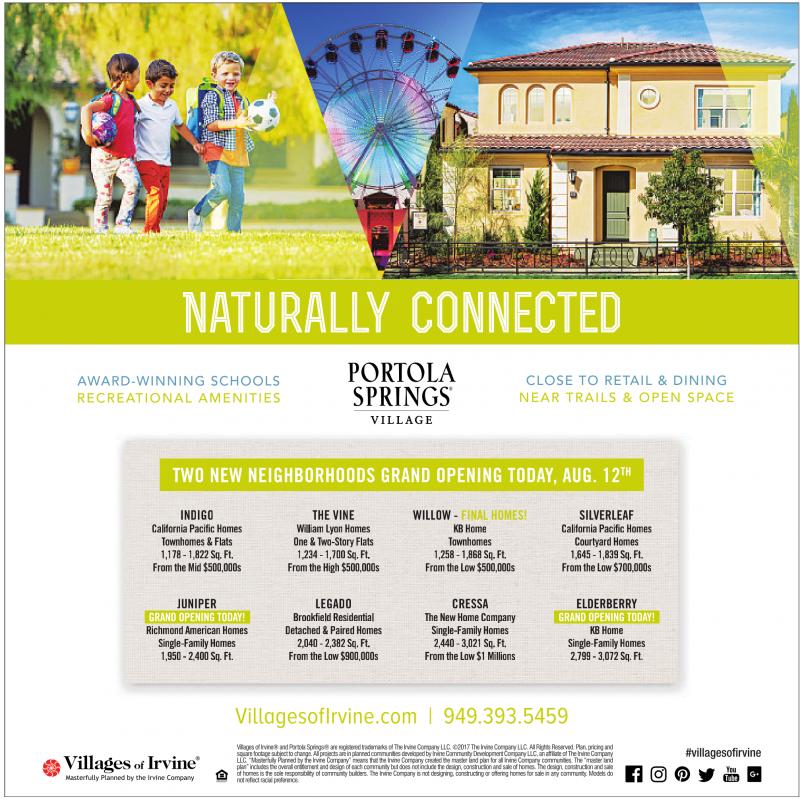 Villages of Irvine® andPortola Springs®are registered trademarks of The Irvine Company LLC. ©2017 The Irvine Company LLC. AllRights Reserved. Plan, pricing and square footage subject to change. Allprojects areinplannedcommunities developed by Irvine Community Development CompanyLLC, an affiliate of The Irvine Company LLC. “Masterfully Planned by theIrvineCompany” means that theIrvineCompany created the master land plan forall Irvine Company communities. The“master land plan”includesthe overall entitlement and design of each communitybut does not include the design, construction and sale of homes. The design, construction and sale of homes is thesole responsibilityofcommunity builders. The Irvine Companyisnot designing,constructingorofferinghomesfor sale in any community.Models do notreflect racialpreference.