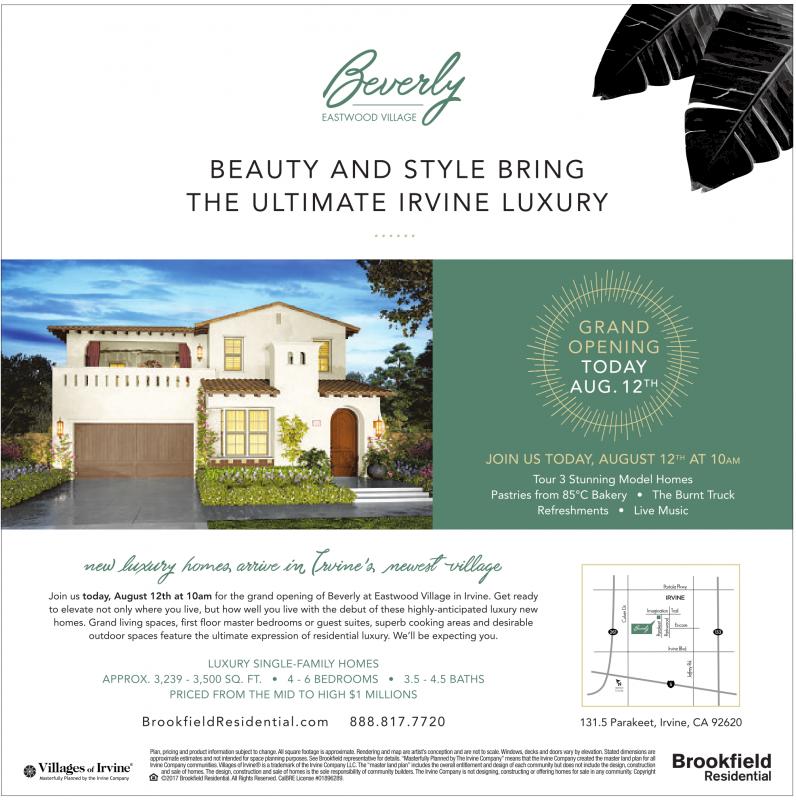 B E A U T Y A N D S T Y L E B R I N G T H E U LT I M AT E I RV I N E L U X U RY ...... GRAND OPENING TODAY AUG. 12 TH JOIN US TODAY, AUGUST 12 TH AT 10AM Tour 3 Stunning Model Homes Pastries from 85°C Bakery • The Burnt Truck Refreshments • Live Music new luxury homes arrive in Irvine’s newest village Join us today, August 12th at 10am for the grand opening of Beverly at Eastwood Village in Irvine. Get ready to elevate not only where you live, but how well you live with the debut of these highly-anticipated luxury new homes. Grand living spaces, first floor master bedrooms or guest suites, superb cooking areas and desirable outdoor spaces feature the ultimate expression of residential luxury. We’ll be expecting you. LUXURY SINGLE-FAMILY HOMES APPROX. 3,239 - 3,500 SQ. FT. • 4 - 6 BEDROOMS • 3.5 - 4.5 BATHS PRICED FROM THE MID TO HIGH $1 MILLIONS BrookfieldResidential.com 888.817.7720 261 133 N MAP NOT TO SCALE IRVINE Imagination Trail 5 Encore 131.5 Parakeet, Irvine, CA 92620 Plan, pricing and product information subject to change.Allsquare footage is approximate. Rendering and mapare artist’sconception and are not to scale.Windows, decks and doors varybyelevation. Stated dimensions are approximate estimates and not intended for space planning purposes. See Brookfield representative for details.“Masterfully Planned by The Irvine Company” means thatthe Irvine Companycreated the master land plan for all Irvine Companycommunities.Villages of Irvine® is atrademark of the Irvine CompanyLLC.The“master land plan” includes the overall entitlement and design of each community but does not include the design, construction and sale of homes. The design, construction and sale of homes is the sole responsibility of community builders. The Irvine Companyisnot designing, constructing or offering homesfor sale in anycommunity.Copyright ©2017 Brookfield Residential. All Rights Reserved. CalBRE License #01896289.