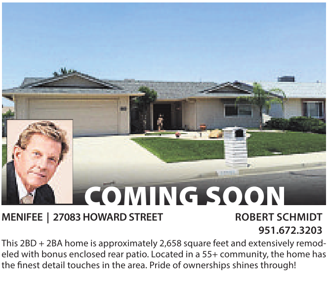 MENIFEE | 27083 HOWARD STREET COMING SOON ROBERTSCHMIDT 951.672.3203 This 2BD +2BA home is approximately 2,658 squarefeet and extensively remodeled withbonus enclosed rear patio. Located in a55+ community, the home has the finest detail touches in the area. Pride of ownerships shines through!