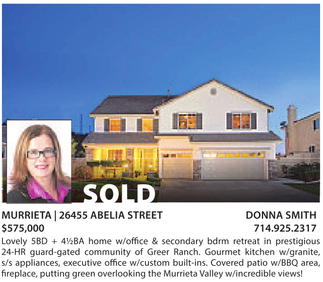 $575,000 714.925.2317 Lovely 5BD + 4½BA home w/office & secondary bdrm retreat in prestigious 24-HR guard-gated community of Greer Ranch. Gourmet kitchen w/granite,
