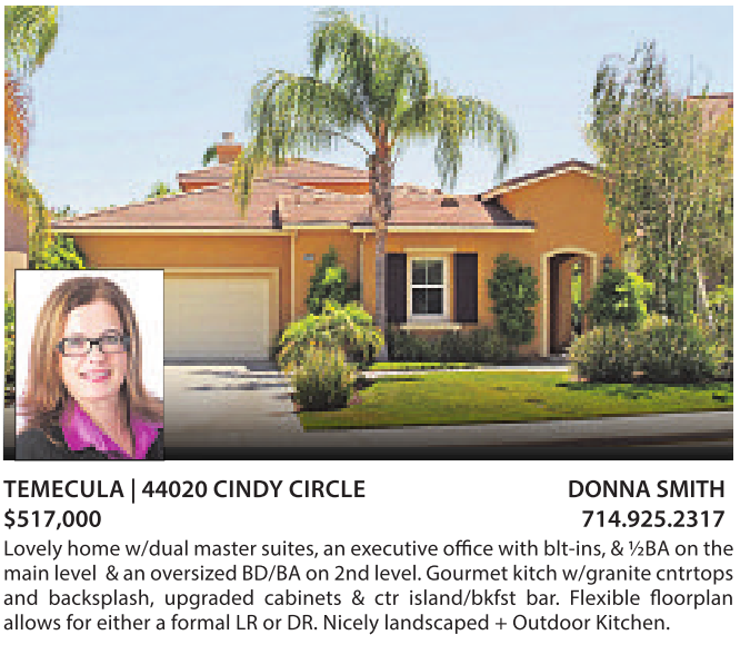 TEMECULA |44020 CINDYCIRCLE DONNA SMITH $517,000 714.925.2317 Lovely home w/dual master suites,anexecutive office withblt-ins,&½BA on the main level &anoversized BD/BA on 2nd level.Gourmet kitchw/granitecntrtops and backsplash, upgraded cabinets & ctr island/bkfst bar. Flexible floorplan allows foreither aformal LR or DR. Nicely landscaped +Outdoor Kitchen.