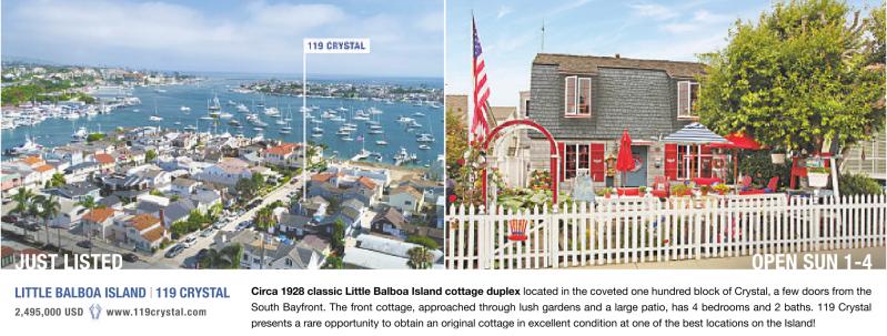JUST LISTED OPEN SUN 1-4 LITTLE BALBOA ISLAND | 119 CRYSTAL 2,495,000 USD www.119crystal.com Circa 1928 classic Little Balboa Island cottage duplex located in the coveted one hundred block of Crystal, a few doors from the South Bayfront. The front cottage, approached through lush gardens and a large patio, has 4 bedrooms and 2 baths. 119 Crystal presents a rare opportunity to obtain an original cottage in excellent condition at one of the best locations on the Island!