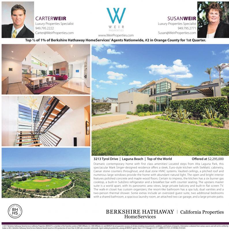 CARTERWEIR Luxury Properties Specialist SUSANWEIR Luxury Properties Specialist 949.795.2222 949.795.2771 Carter@WeirProperties.com Susan@WeirProperties.com www.WeirProperties.com Top ½ of 1% of Berkshire Hathaway HomeServices’Agents Nationwide, #2 in Orange County for 1st Quarter. 3213 Tyrol Drive | Laguna Beach | Top of the World Offered at $2,295,000 Dramatic contemporary home with first class amenities! Located steps from Alta Laguna Park, this spectacular Mark Singer-designed residence offers a sleek, Euro-style kitchen with SieMatic cabinetry, Caesar stone counters throughout, and dual zone HVAC systems. Vaulted ceilings, a pitched roof and numerous large windows provide the home with abundant natural light. The open and bright interior features polished concrete and maple wood floors. Certain to impress, the kitchen has a six burner gas cooktop, a built-in SubZero refrigerator and a breakfast bar with counter seating. The upstairs master suite is a world apart, with its panoramic area views, large private balcony and built-in flat screen TV. The walk-in closet has custom organizers; the resort-like bathroom has a spa tub, dual vanities and a two-person thermal shower. Some extras include an oversized guest suite, two additional bedrooms with a shared bathroom, a spacious laundry room, an attached two car garage, and a large private patio. ©2017 BerkshireHathaway HomeServices California Properties (BHHSCP)isamember of the franchise system of BHH AffiliatesLLC.BHH AffiliatesLLC and BHHSCP do not guaranteeaccuracyofall data including measurements,conditions,and features of property.Information is obtained from varioussources and will not be verified by broker or MLS. BerkshireHathaway HomeServices National Awards based on 2016 production of morethan 42,000 sales associatesnationwide.Agentranking by production, among all BHHSCP agents,from1/1/17through 3/31/17. CalBRE 01317331, 01109388, 01455381.