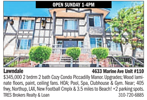 OPEN SUNDAY1-4PM Lawndale 4633 Marine Ave Unit #110 $345,000 2brdrm 2bathCozyCondoPiccadilly Manor.Upgrades; Wood laminate floors, paint, ceiling fans. HOA; Pool, Spa,Clubhouse &Gym. Near;405 frwy,Northup,LAX,NewFootball Cmplx &3.5 miles to Beach!+2parking spots. TRESBrokersRealty &Loan 310-720-6885