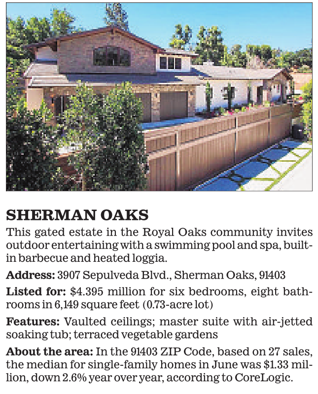 About the area: In the 91403 ZIP Code, based on 27 sales, the median for single-family homes in June was $1.33 million, down 2.6% year over year, according to CoreLogic.