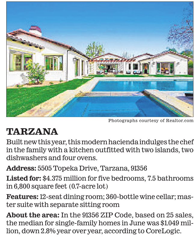 TARZANA Built new this year, this modern hacienda indulges the chef in the family with a kitchen outfitted with two islands, two dishwashers and four ovens.