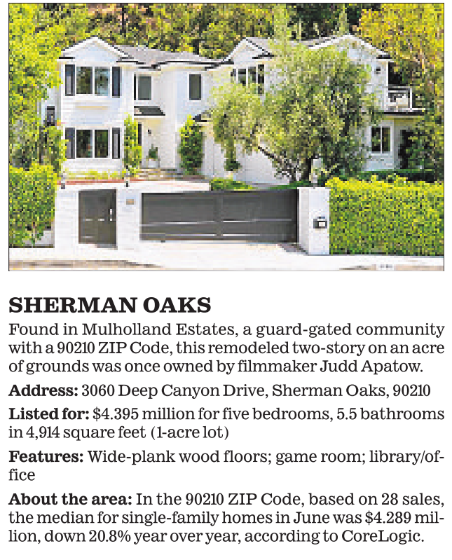 SHERMAN OAKS Found in Mulholland Estates, a guard-gated community with a 90210 ZIP Code, this remodeled two-story on an acre of grounds was once owned by filmmaker Judd Apatow.