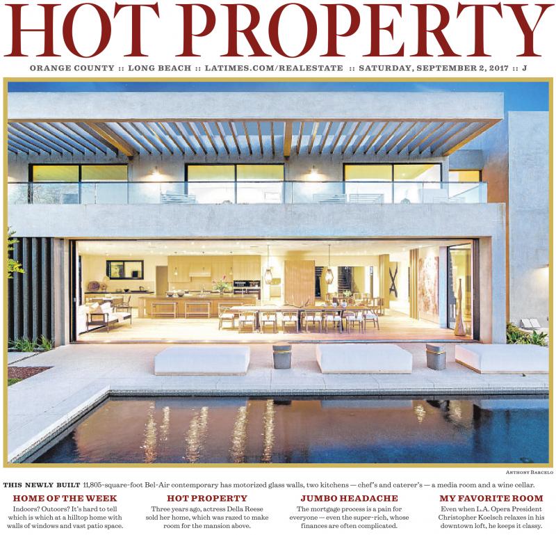 THIS NEWLY BUILT 11,805-square-foot Bel-Air contemporary has motorized glass walls, two kitchens — chef’s and caterer’s — a media room and a wine cellar.