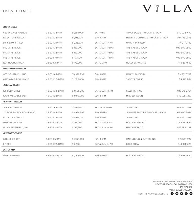 COSTA MESA 1620 ORANGE AVENUE 3 BED | 3 BATH $1,599,000 SAT 1-4PM TRACY BOWIE, TIM CARR GROUP 949 922 1670 219 SANTA ISABELLA 3 BED | 3 BATH $1,195,000 SUN 1-4PM MELISSA CUMMINGS, TIM CARR GROUP 949 798 9466 245 SIERKS STREET 3 BED | 2 BATH $1,125,000 SAT & SUN 1-4PM NANCY BARFIELD 714 271 0789 1940 VITAE PLACE 3 BED | 3 BATH $833,900 SAT & SUN 11-5PM THE CASEY GROUP 949 689 2509 1942 VITAE PLACE 3 BED | 3 BATH $833,900 SAT & SUN 11-5PM THE CASEY GROUP 949 689 2509 1946 VITAE PLACE 2 BED | 3 BATH $797,900 SAT & SUN 11-5PM THE CASEY GROUP 949 689 2509 2331 TICONDEROGA 2 BED | 2 BATH $475,000 SAT 12-2PM HOLLY SCHWARTZ 714 928 4682 HUNTINGTON BEACH 16552 CHANNEL LANE 4 BED | 4 BATH $3,999,999 SUN 1-4PM NANCY BARFIELD 714 271 0789 16397 WIMBLEDON LANE 4 BED | 2.5 BATH $1,595,000 SUN 1-4PM SANDY POWERS 714 342 1194