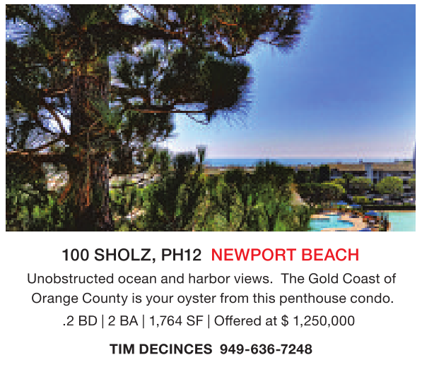 100 SHOLZ, PH12 NEWPORT BEACH Unobstructed ocean and harbor views. The Gold Coast of Orange County is your oyster from this penthouse condo.