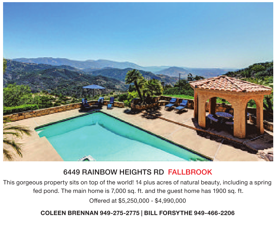 6449 RAINBOW HEIGHTS RD FALLBROOK This gorgeous property sits on top ofthe world! 14 plus acres of natural beauty, including aspring fed pond. The main home is 7,000 sq. ft. and the guest home has 1900 sq. ft.